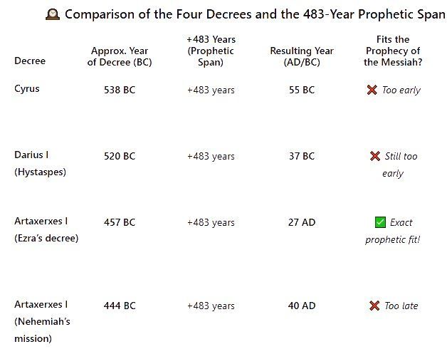 When we examine the above decrees, we can clearly see that there's only one decree that is correctly timed. The 457 BC decree was issued 483 years before Christ's anointing by the Holy Spirit.