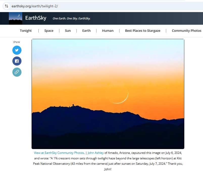 In case the caption is too small, here's what it says: "View at EarthSky Community Photos. | John Ashley of Amado, Arizona, caputured this image on July 6, 2024, and wrote: “A 1% crescent moon sets through twilight haze beyond the large telescopes (left horizon) at Kitt Peak National Observatory (43 miles from the camera) just after sunset on Saturday, July 7, 2024.” Thank you, John!" (https://earthsky.org/earth/twilight-2/)