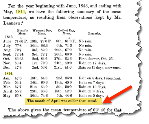 - March 29, 1844 (April 10) - It was very cold; a wind blew from the west, bringing with it a sharp chill...The weather here has long been cold and rainy.
