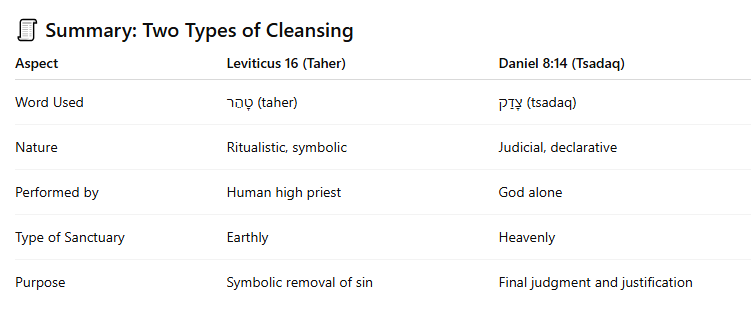 So, when critics ask, "How can Daniel 8:14 refer to the same cleansing if the words are different?", the answer is: It’s because the earthly cleansing is a ceremonial cleansing, but the heavenly cleansing is a righteous cleansing. This difference in language confirms, rather than contradicts, the Adventist teaching of the Investigative Judgment.